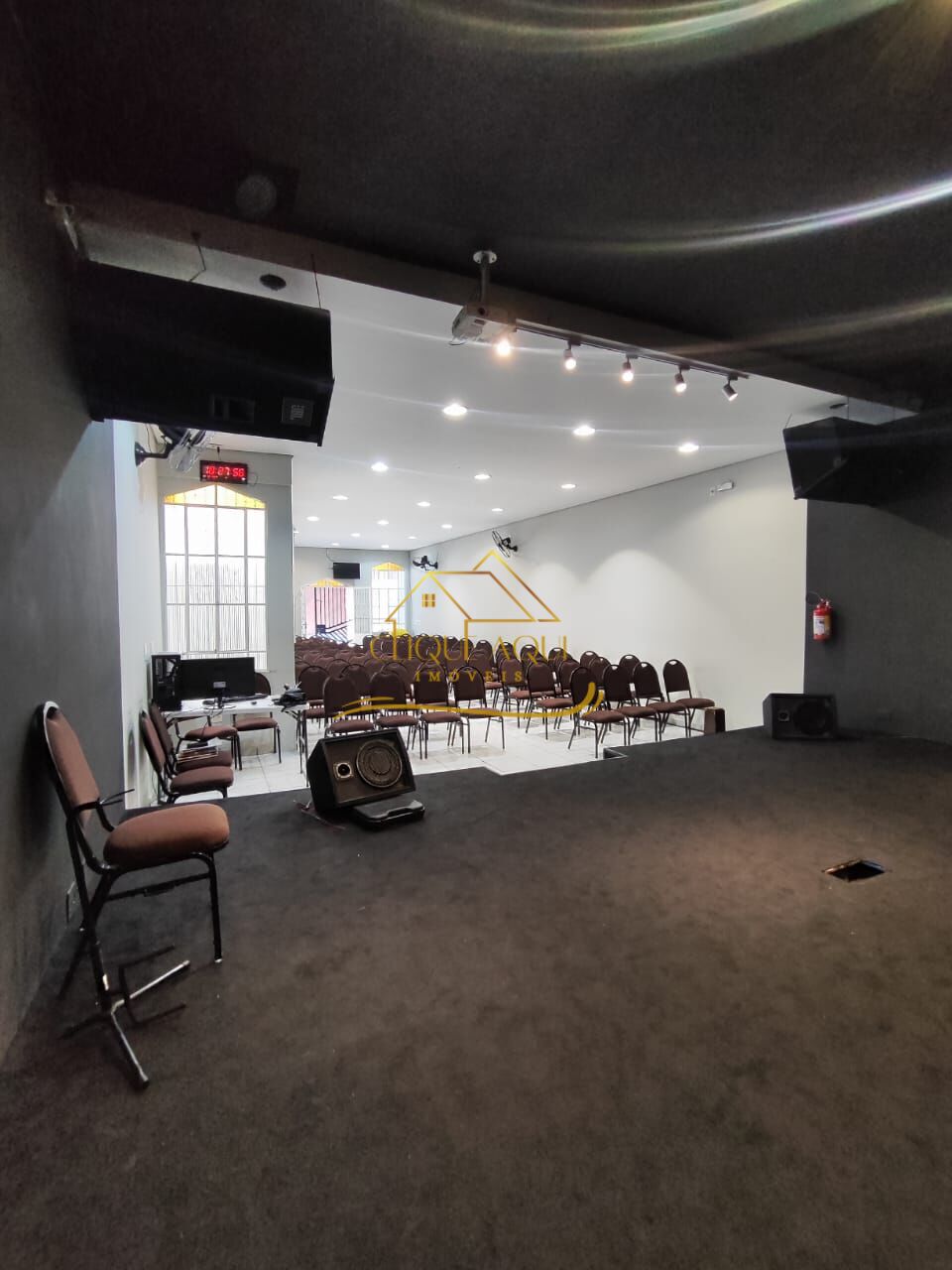 Salão principal com espaço para 150 pessoas sentadas, com acesso ao andar de baixo nos fundos do salão.